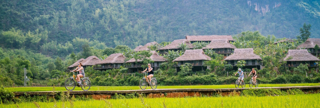 Cách Hà Nội chỉ khoảng 3 tiếng chạy xe, Mai Châu mang lại cảm giác khác hoàn toàn với Thủ đô đông đúc, nhộn nhịp. Tại đây, bạn sẽ được hít thở không khí trong lành, tràn ngập hương lúa nhờ những cánh đồng lúa rộng khắp, xa xa là núi đồi bao quanh ẩn hiện dưới làn mây. Mai Chau Ecolodge luôn được mệnh danh là “thiên đường xanh trong thung lũng”.